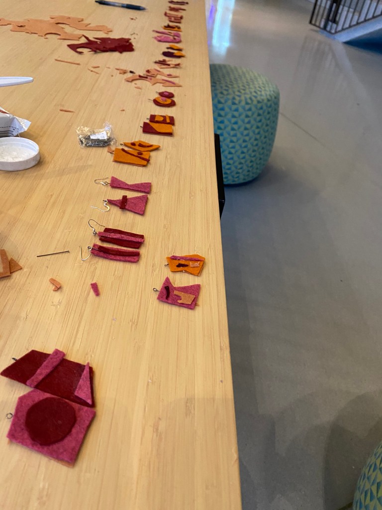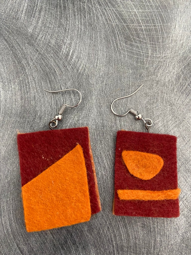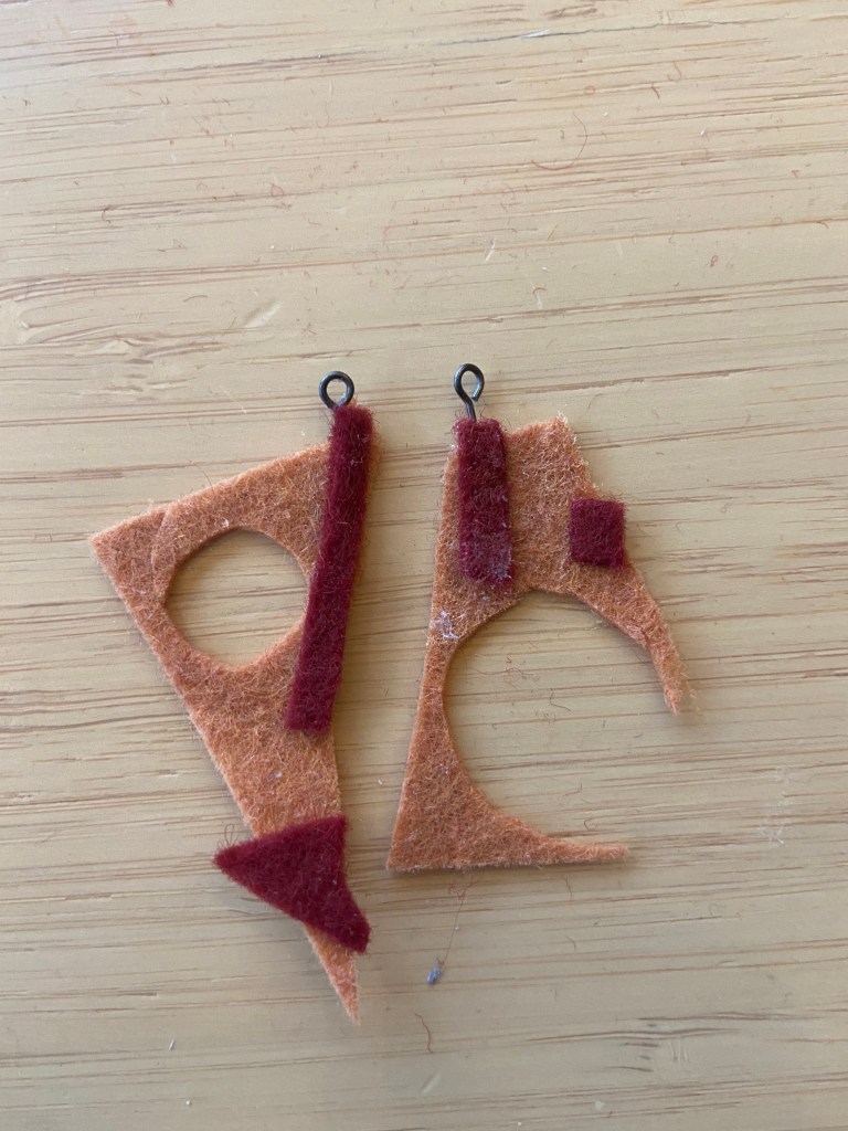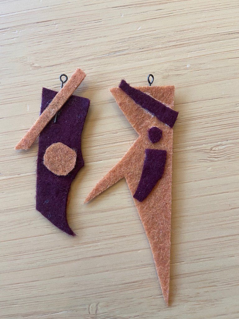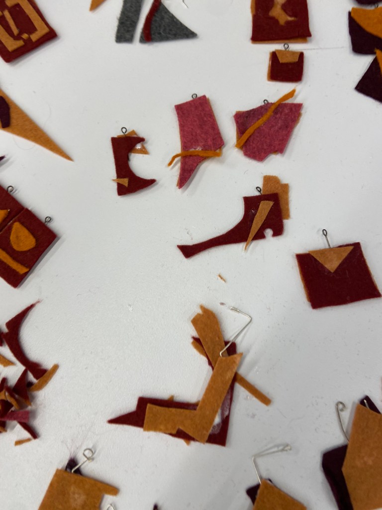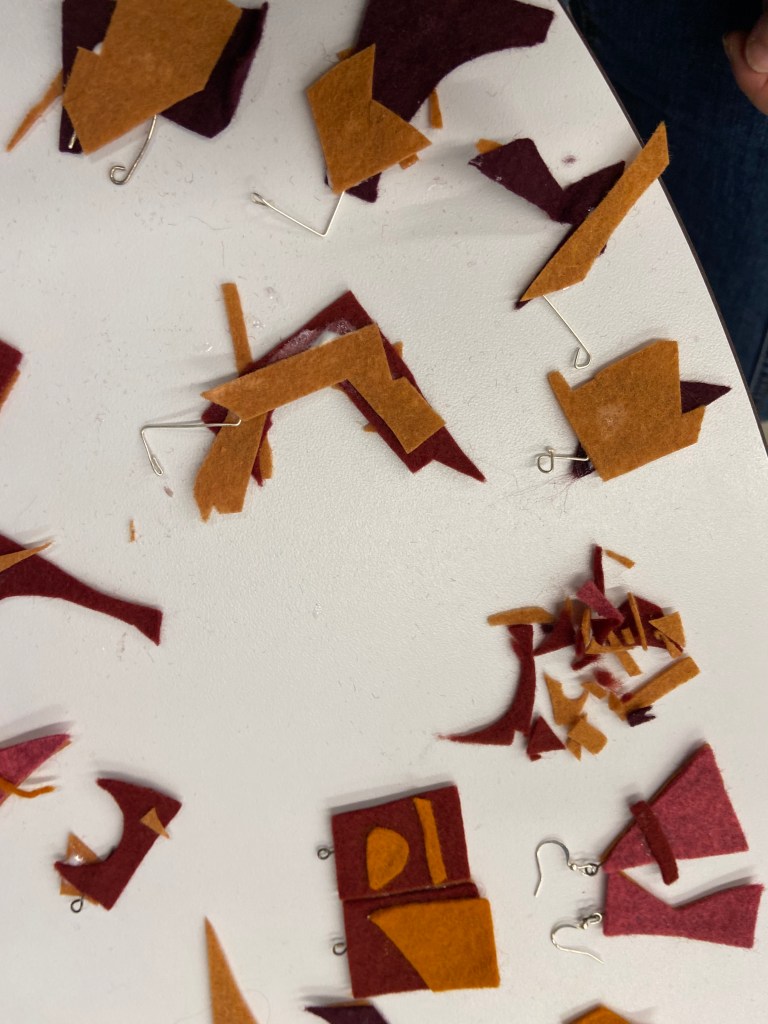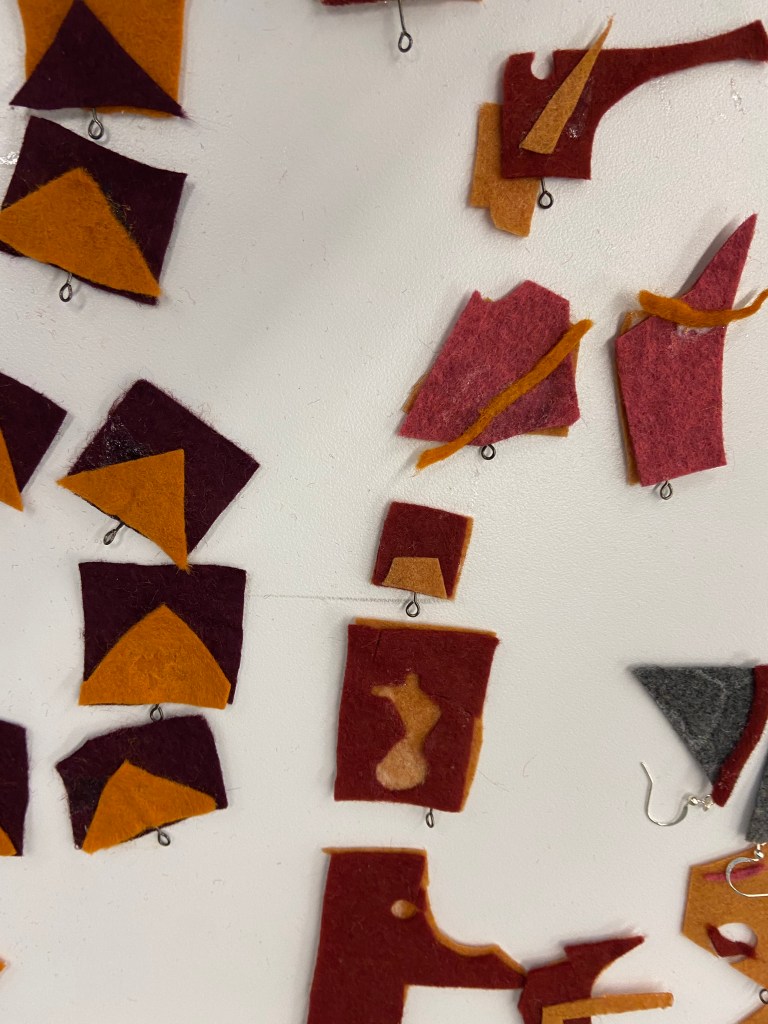 During the pandemic, I made jewelry out of felt, in the shapes of left over scraps. By using scraps, unexpected abstract shapes emerge, as shown below.