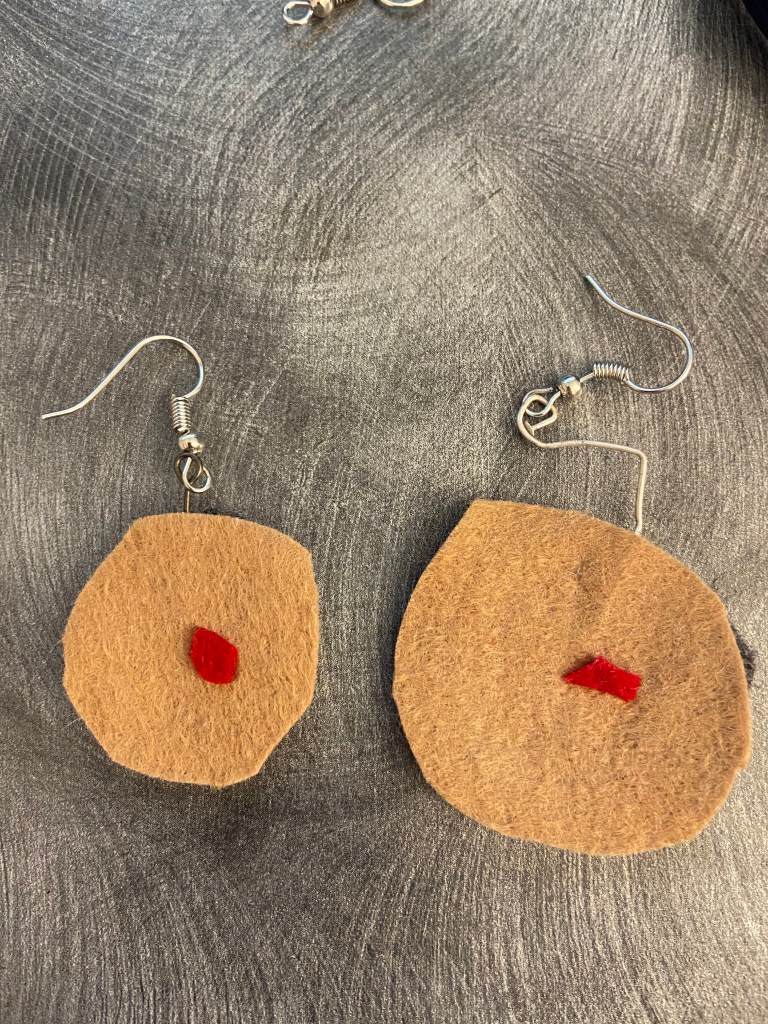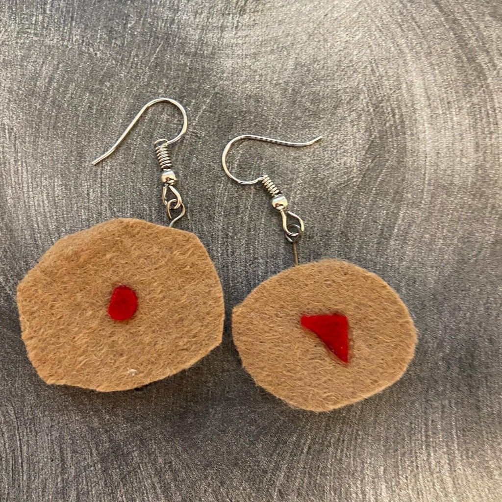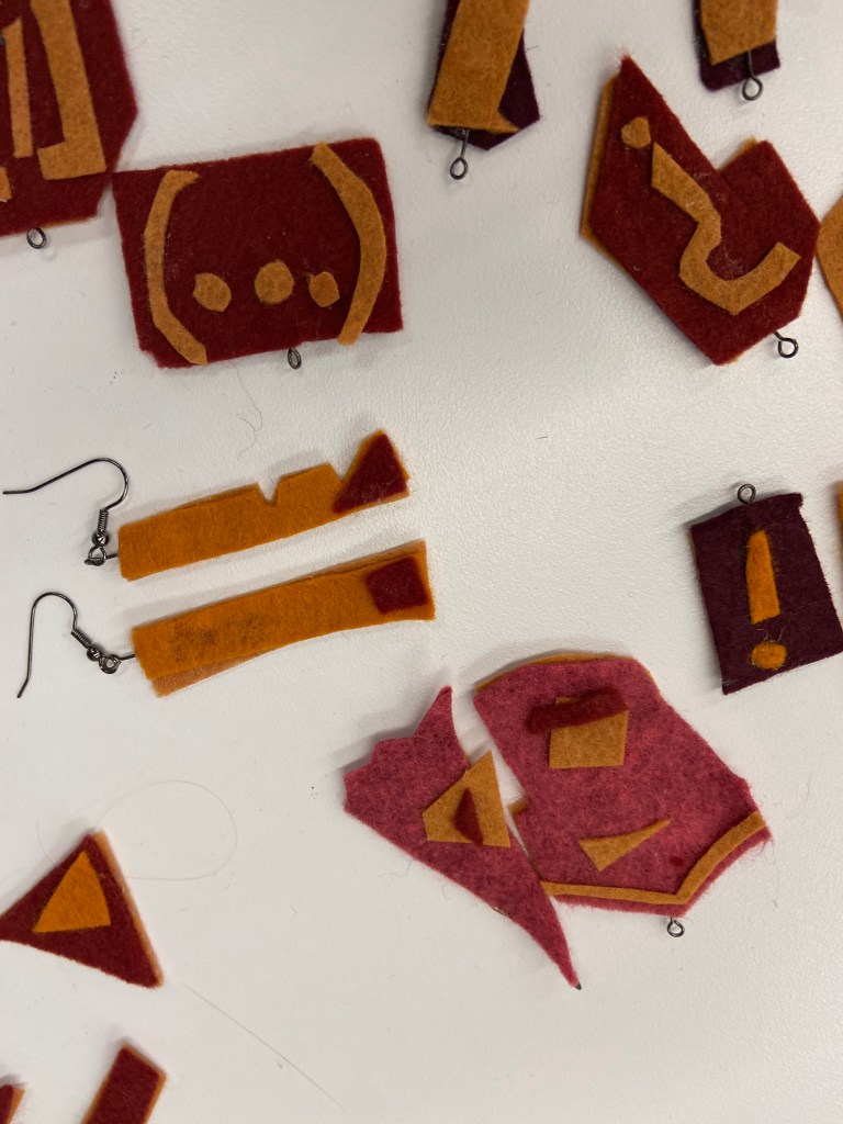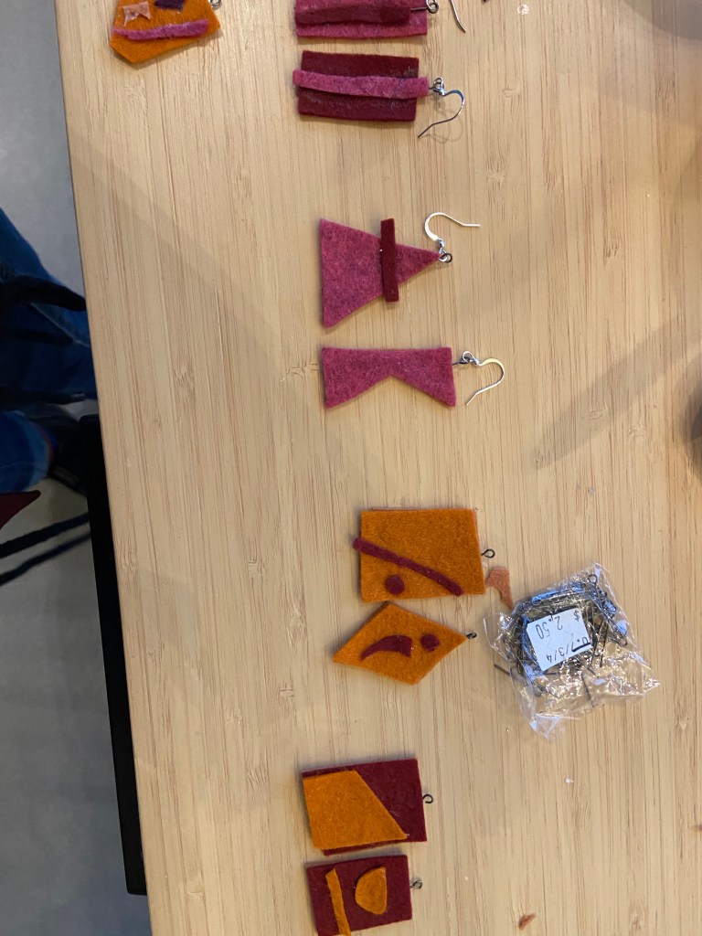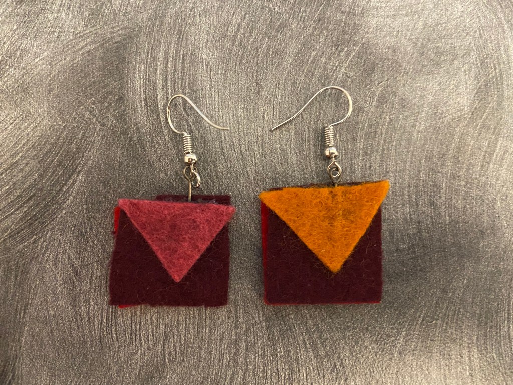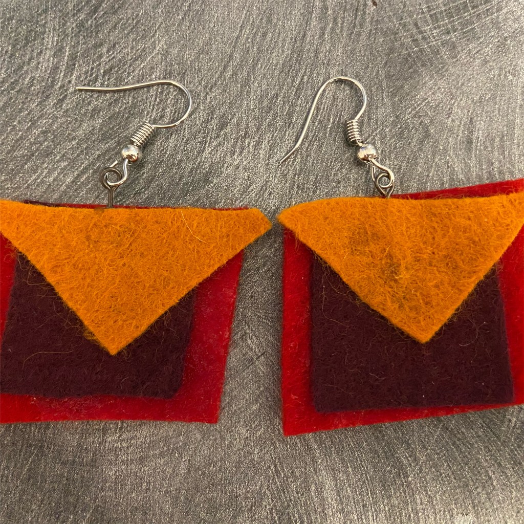 During the pandemic, I made jewelry out of felt, in the shapes of left over scraps. By using scraps, unexpected abstract shapes emerge, as shown below.