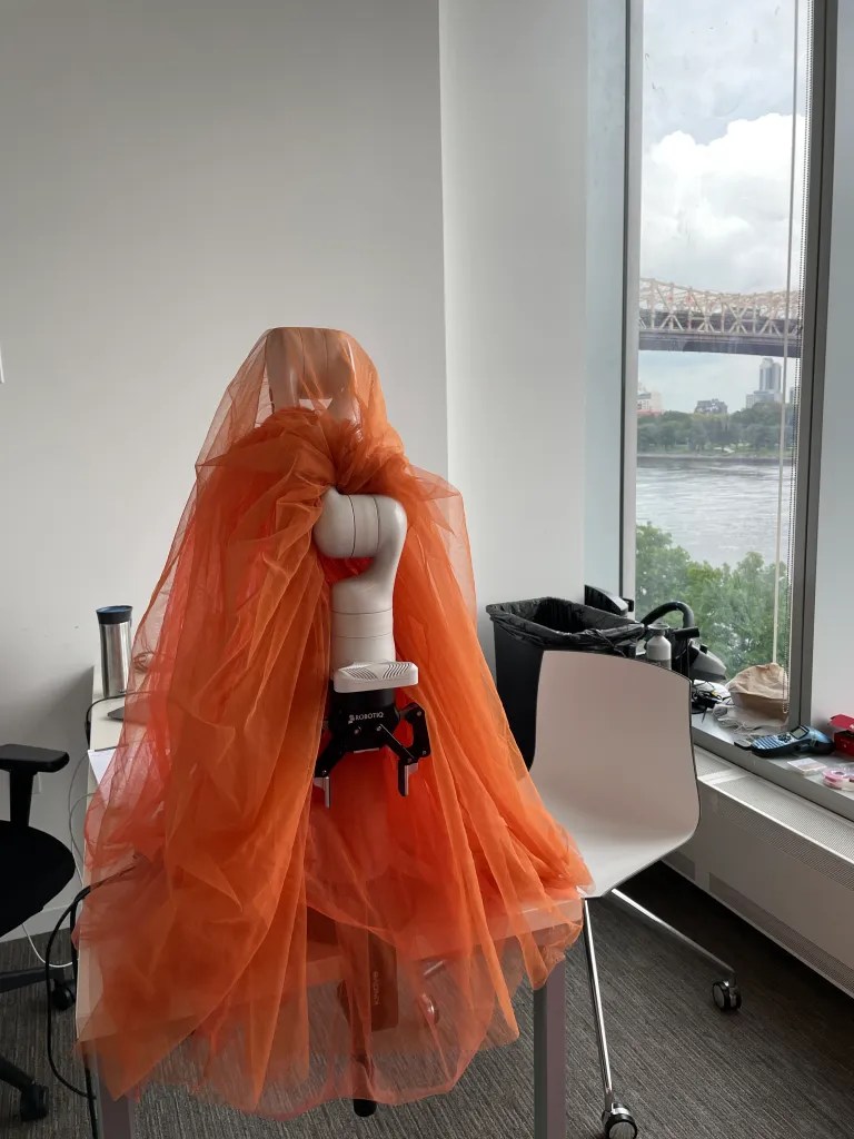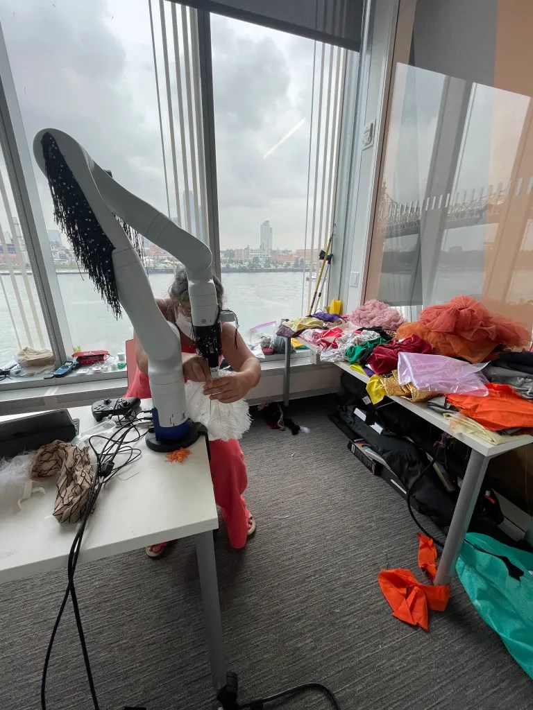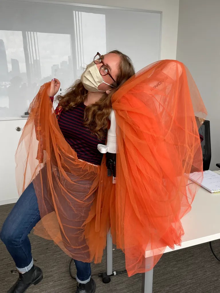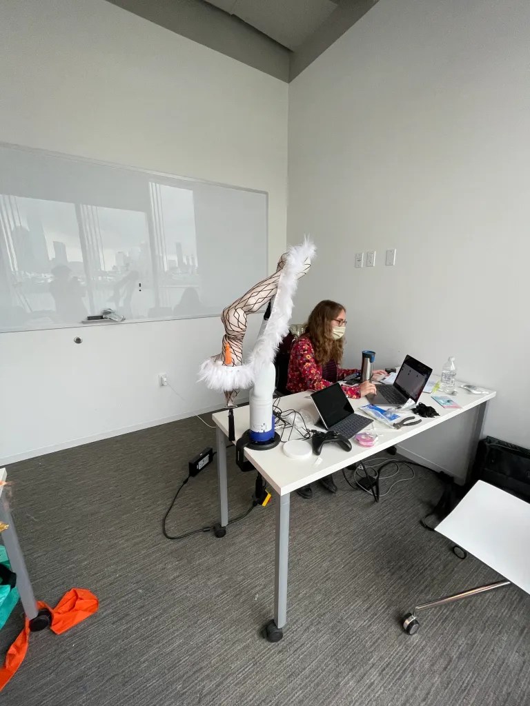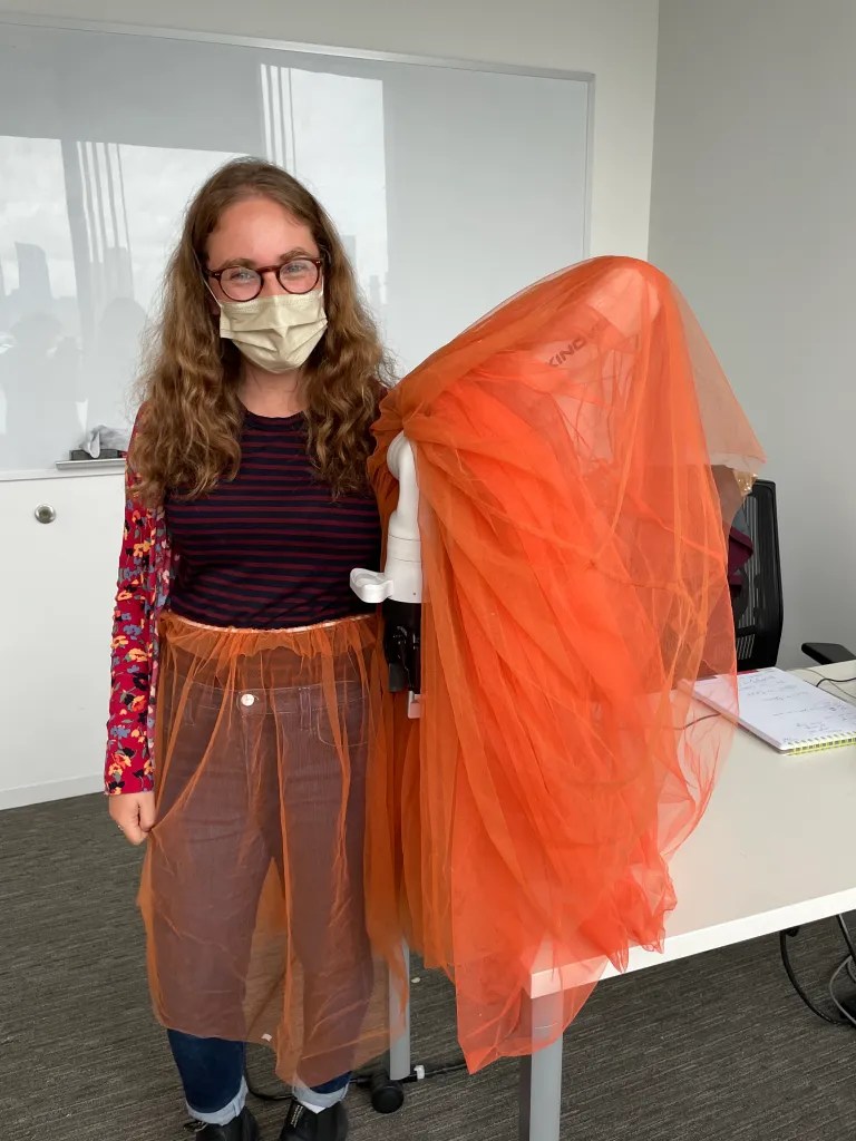 Kari Love and I explored forms and materials for dressing the Kinova Gen 3, a 7 degree of freedom robot arm. We were interested in how a variety of materials would move on a robot arm moving in a chroeographed way. We asked the questions, how might materials stay on the robot in movement? How can we ensure that the materials don’t get twisted at the joints of the robot arm? What is sexy clothes and motion for a robot?