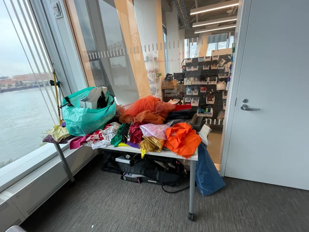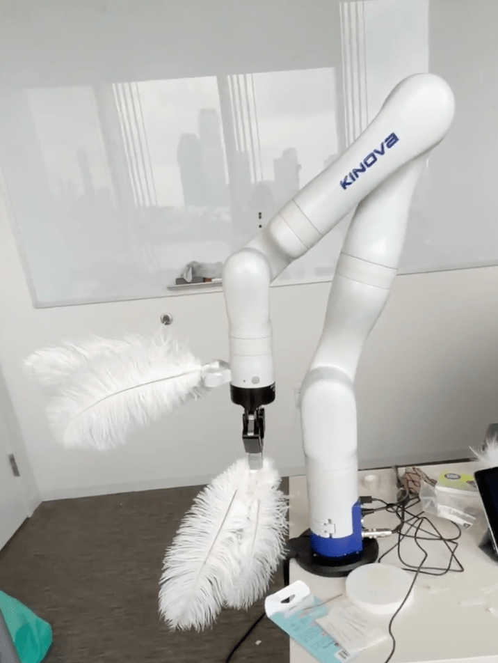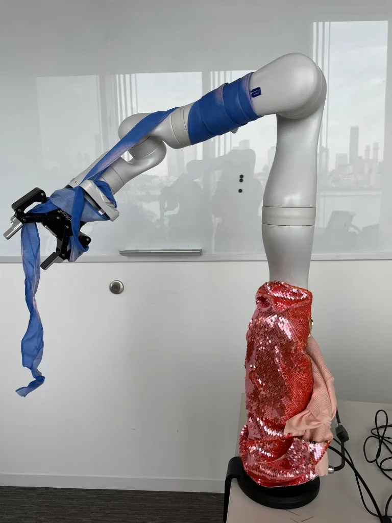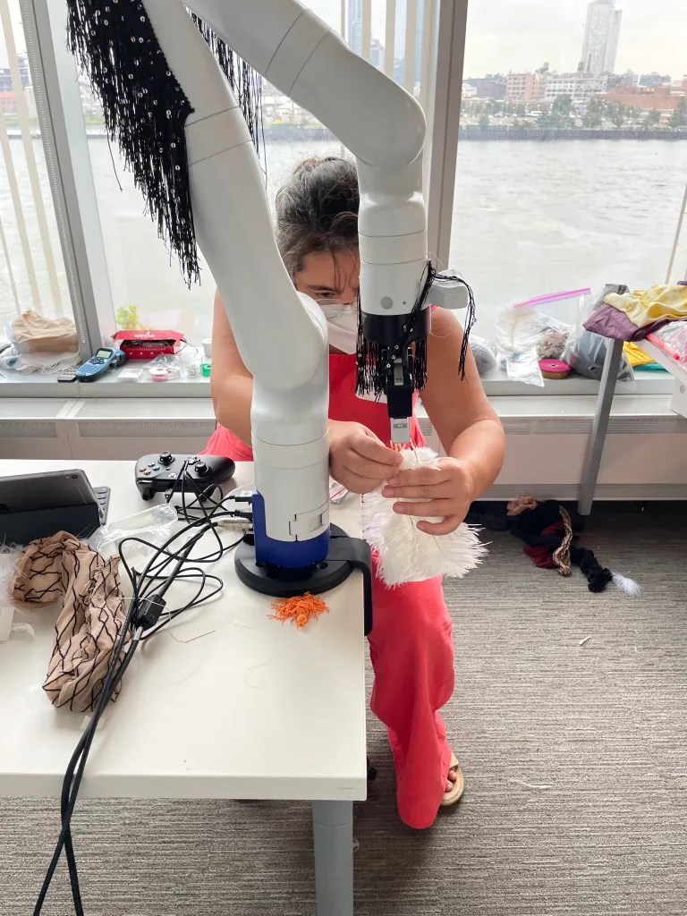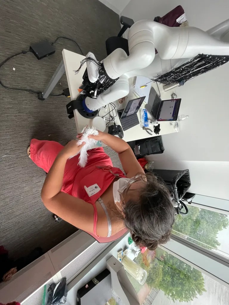 Kari Love and I explored forms and materials for dressing the Kinova Gen 3, a 7 degree of freedom robot arm. We were interested in how a variety of materials would move on a robot arm moving in a chroeographed way. We asked the questions, how might materials stay on the robot in movement? How can we ensure that the materials don’t get twisted at the joints of the robot arm? What is sexy clothes and motion for a robot?